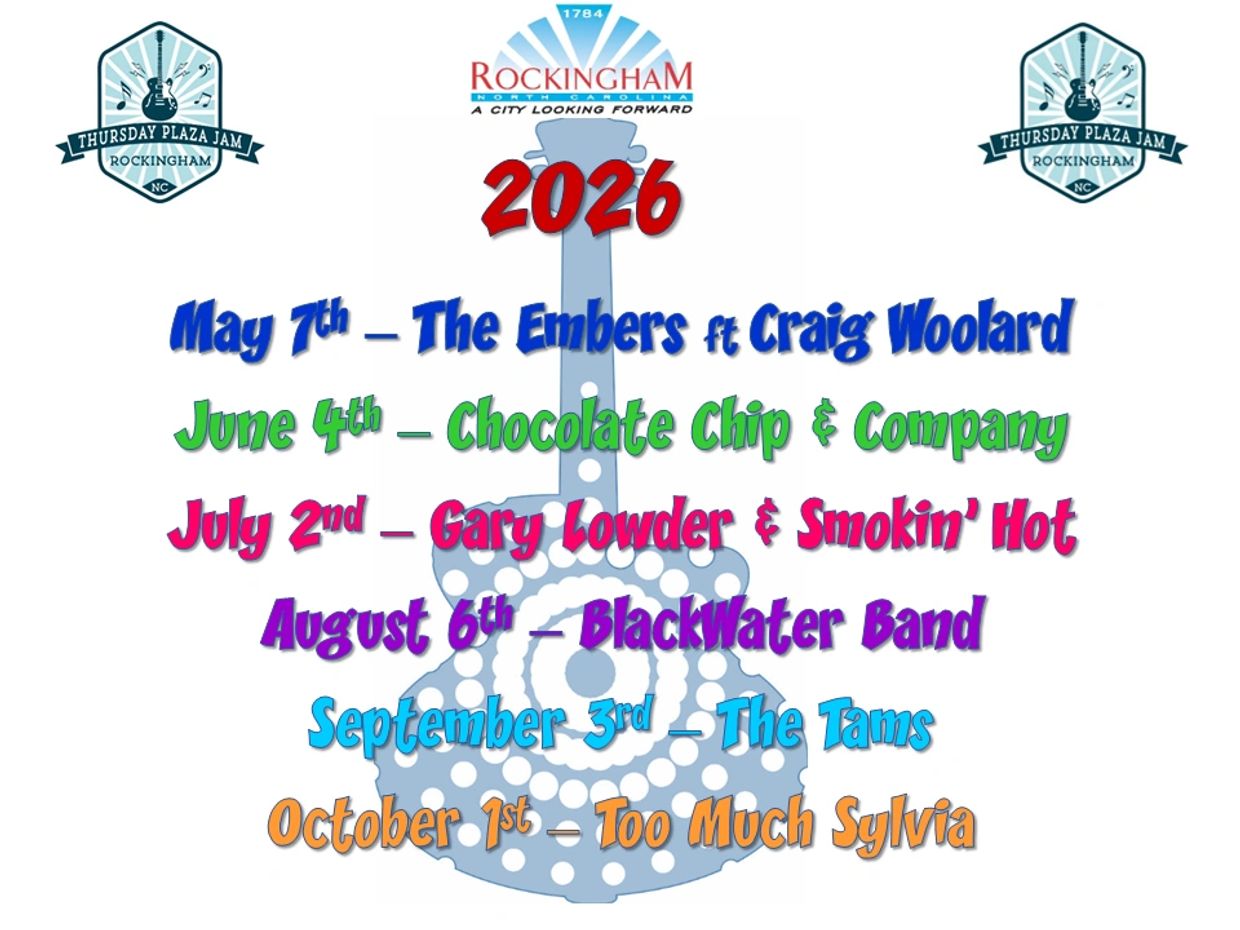 Thursday Plaza Jam is the 1st Thursday of the month's May-October on Cole Plaza (514 Rockingham Road) from 6:30pm - 8:30pm.